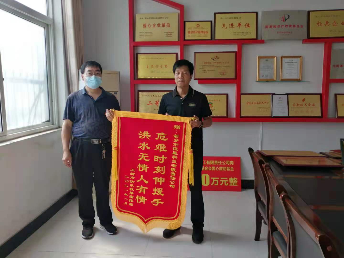 災情過后,衛輝城市正在逐漸恢復生機,衛輝防汛抗旱指揮部為恒星公司送來了“危難時刻伸援手,洪水無情人有情”的錦旗。